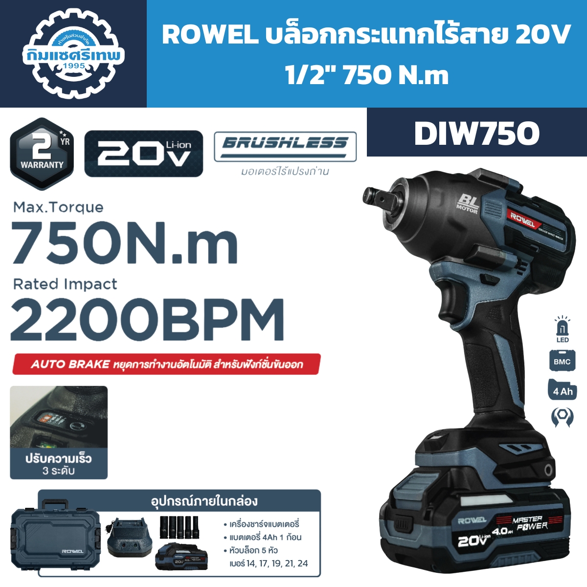- ตัวเครื่อง: บล็อกกระแทกไร้สาย ROWEL รุ่น DIW750 (20V)