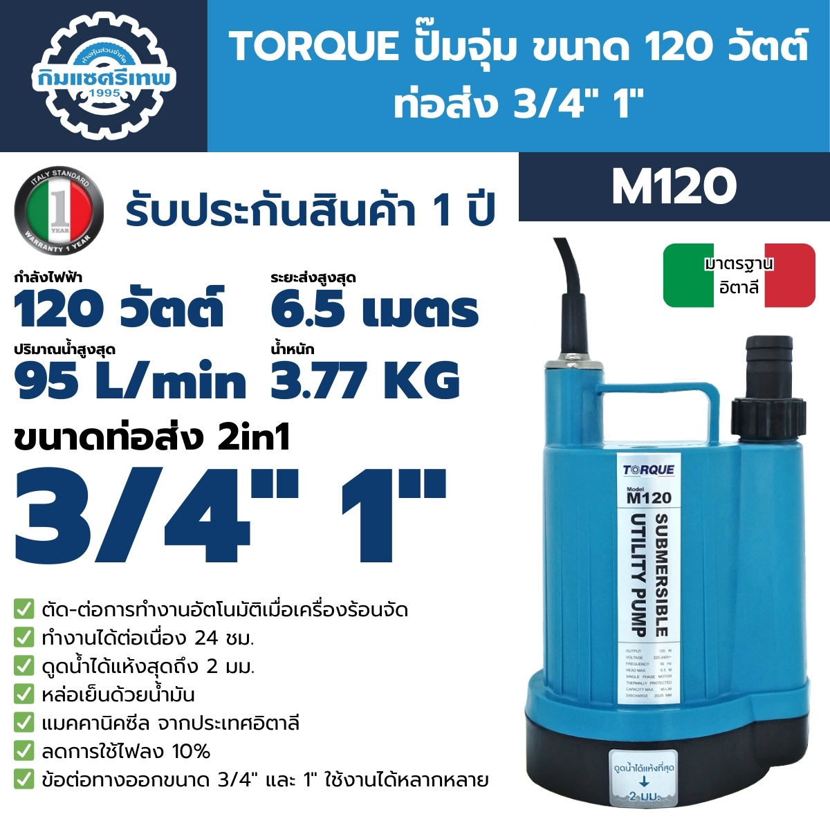 ปั๊มจุ่ม 120 วัตต์ ท่อส่ง 3/4" 1" ทอร์ค รุ่น M120