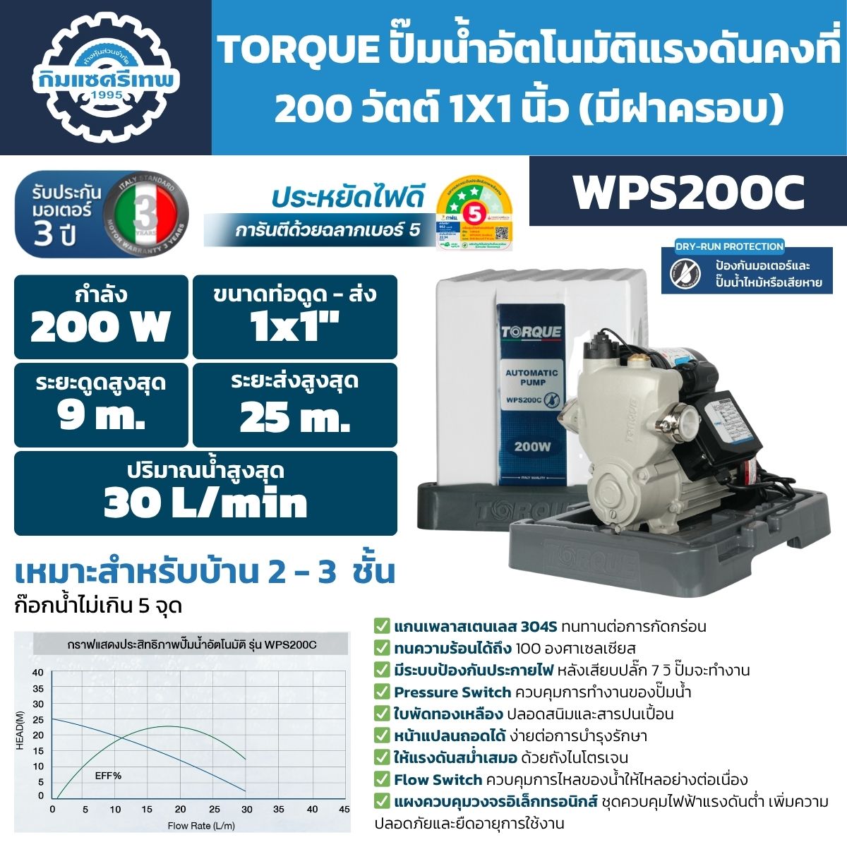 ปั๊มน้ำอัตโนมัติแรงดันคงที่ ทอร์ค (TORQUE) 200 วัตต์ รุ่น WPS200C
