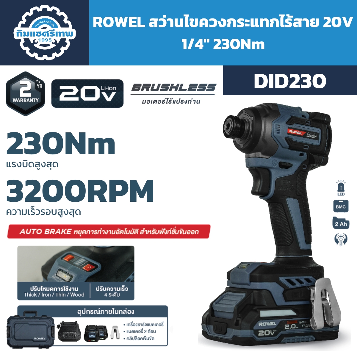 - ตัวเครื่อง: สว่านไขควงกระแทก ROWEL รุ่น DID230 (20V)