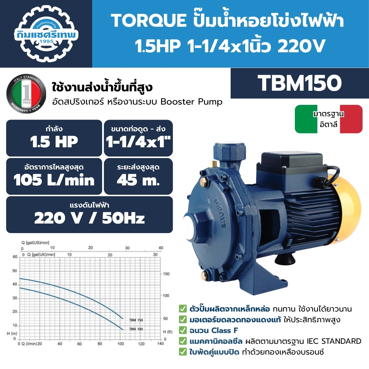 ปั๊มน้ำหอยโข่งไฟฟ้า TORQUE 1.5HP แรงดันสูง 2 ใบพัด รุ่น TBM150 (ท่อ 1-1/4"x1")