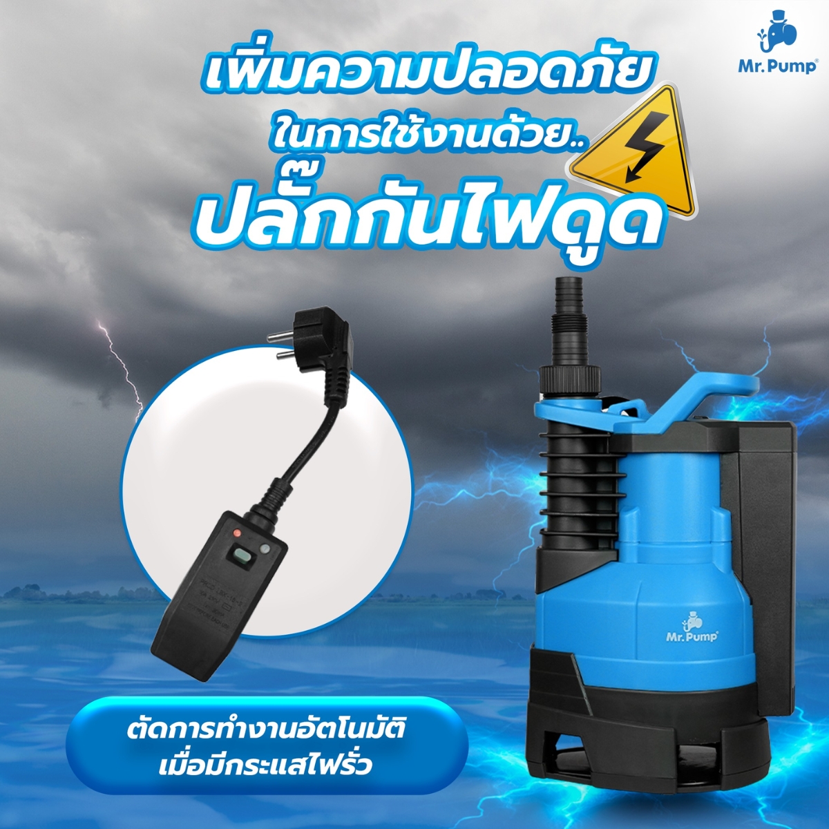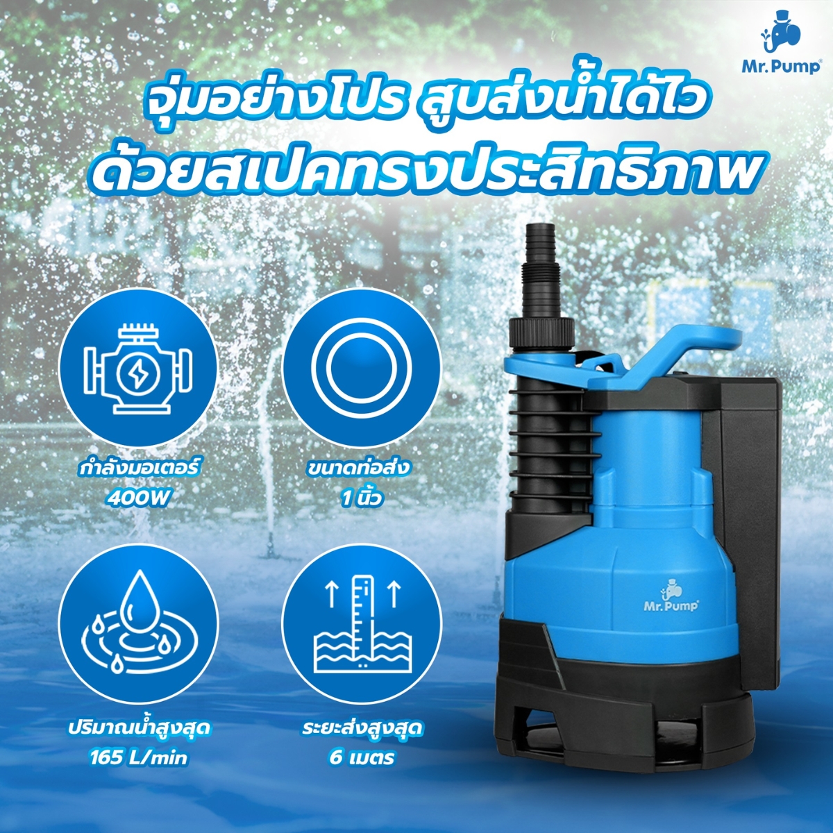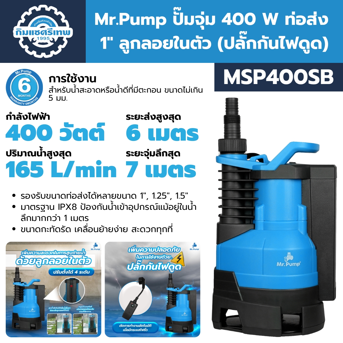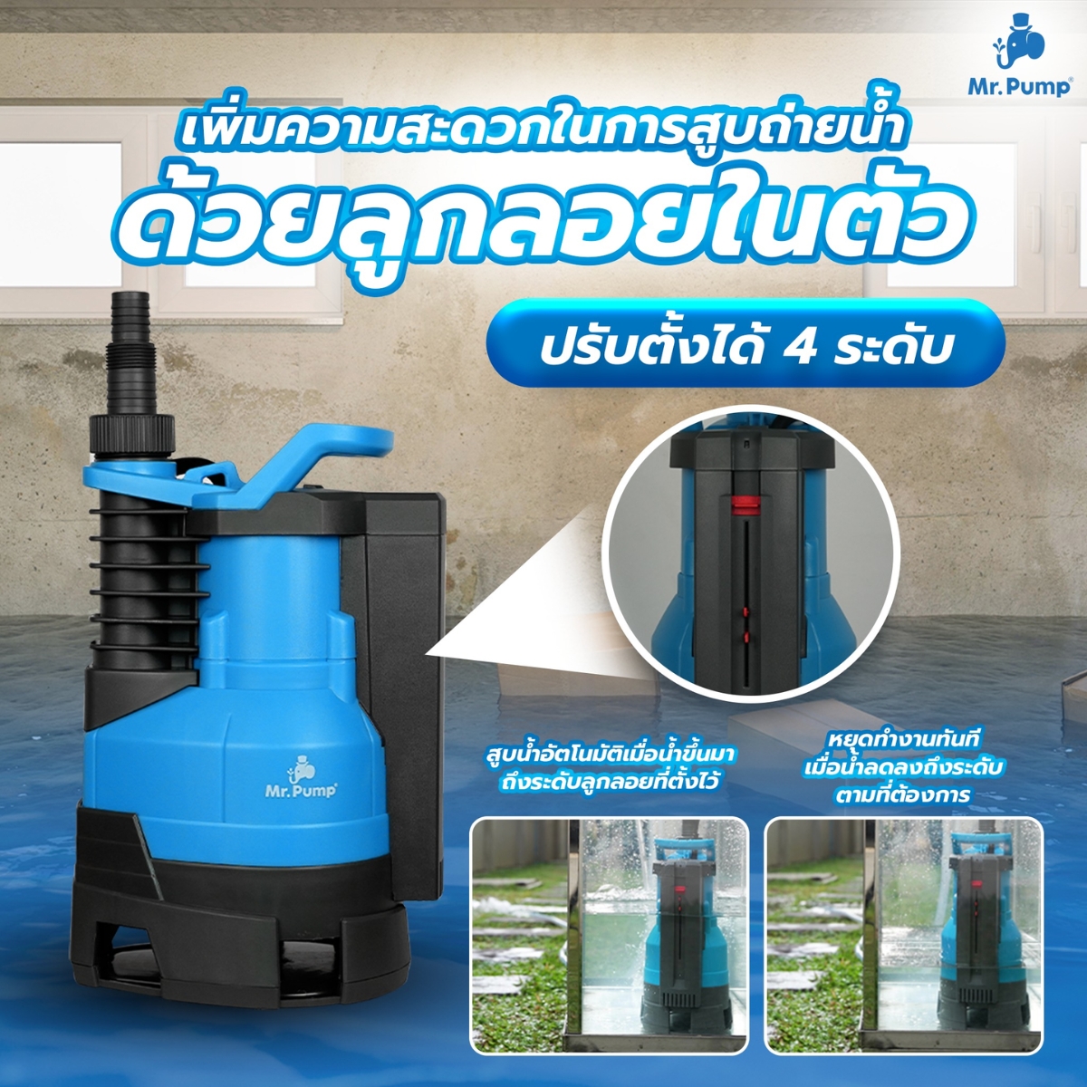 ปั๊มจุ่ม Mr.Pump รุ่น MSP400SB ปั๊มจุ่มขนาดกะทัดรัด กำลังไฟ 400 วัตต์ เหมาะสำหรับดูดน้ำท่วม หรือน้ำฝนในพื้นที่จำกัด มาพร้อมสวิตช์ลูกลอยในตัว ปลั๊กนิรภัยกันไฟดูด และมาตรฐาน IPX8 ปลอดภัย ใช้งานง่ายสำหรับงานระบายน้ำทั่วไป เหมาะกับพื้นที่บ้าน โรงจอดรถ หรือบ่อน้ำขนาดเล็ก ด้วยขนาดกะทัดรัด พกพาสะดวก พร้อมฟังก์ชันใช้งานที่ครบถ้วน ทั้งระบบลูกลอยในตัว และปลั๊กนิรภัยกันไฟดูด เพื่อความปลอดภัยสูงสุดในการใช้งาน