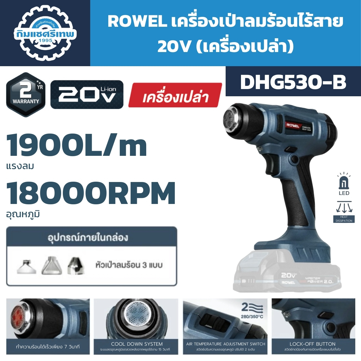 ตัวช่วยให้ความร้อนสูง สำหรับงานติดตั้งซ่อมแซมต่าง ๆ ได้อย่างมีประสิทธิภาพ ด้วยเครื่องเป่าลมร้อนไร้สาย จาก ROWEL (สินค้าจำหน่ายเฉพาะตัวเครื่อง ไม่รวมแบตเตอรี่และแท่นชาร์จ) ปรับความร้อนได้ 2 ระดับ ให้อุณหภูมิตั้งแต่ 280 – 530 องศาเซลเซียส ขนาดเล็ก น้ำหนักเบา เหมาะสำหรับงานที่ต้องการทำให้แห้ง เช่น งานประกอบ, งานสี, งานทากาวยึด, งานเดินสายไฟ