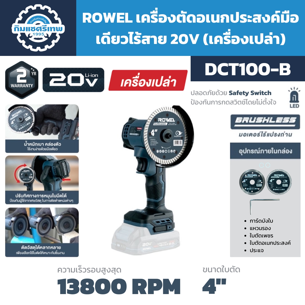 ROWEL เครื่องตัดอเนกประสงค์ไร้สายขนาดกะทัดรัด รุ่น DCT100-B 20V ออกแบบเพื่อการตัดที่คล่องตัวและทรงพลัง มอเตอร์ Brushless รอบสูง 13,800RPM พร้อมใบตัด 4 นิ้ว ให้ความลึกการตัดสูงสุด 20 มม. ปลอดภัยด้วยสวิตช์ Safety Switch และไฟ LED ส่องสว่าง เหมาะสำหรับงานตัดโลหะบาง ไม้ พลาสติก และวัสดุต่างๆ น้ำหนักเบาเพียง 1 กก. ใช้งานง่ายด้วยมือเดียวDCT100-B 20V เครื่องตัดอเนกประสงค์ไร้สายขนาดกะทัดรัด ออกแบบเพื่อการตัดที่คล่องตัวและทรงพลัง มอเตอร์ Brushless รอบสูง 13,800RPM พร้อมใบตัด 4 นิ้ว ให้ความลึกการตัดสูงสุด 20 มม. ปลอดภัยด้วยสวิตช์ Safety Switch และไฟ LED ส่องสว่าง เหมาะสำหรับงานตัดโลหะบาง ไม้ พลาสติก และวัสดุต่างๆ น้ำหนักเบาเพียง 1 กก. ใช้งานง่ายด้วยมือเดียว