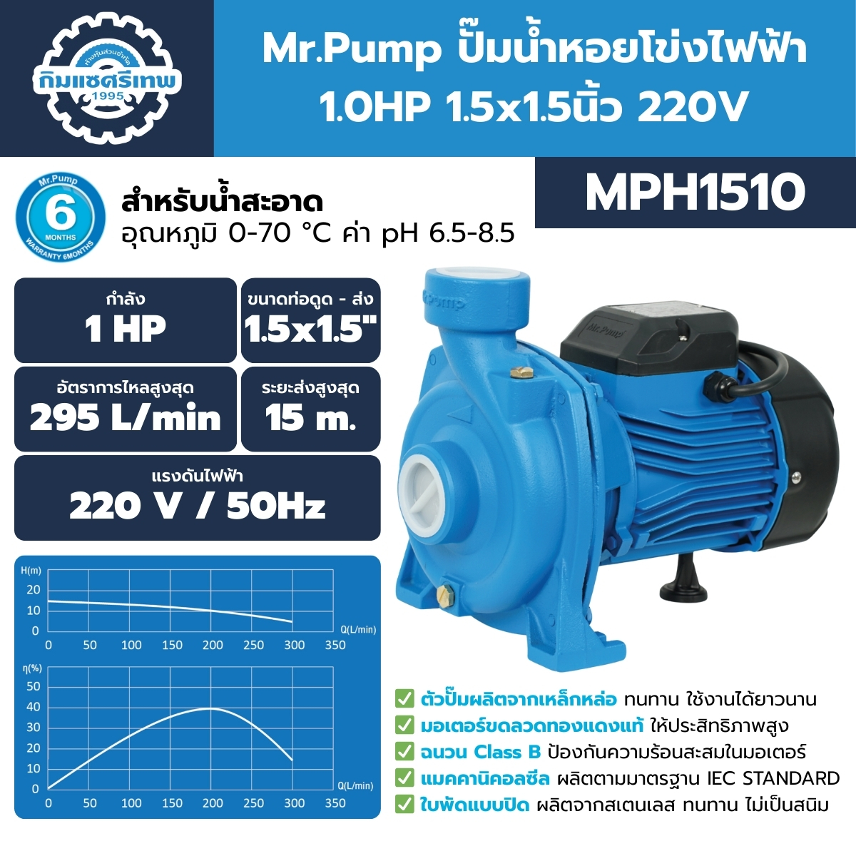 | Model | HP | KW | Piep (inch) | Single Phase 1 เฟส 220V/50Hz | Max.Flow (L/min) | Max.Head (m.) |