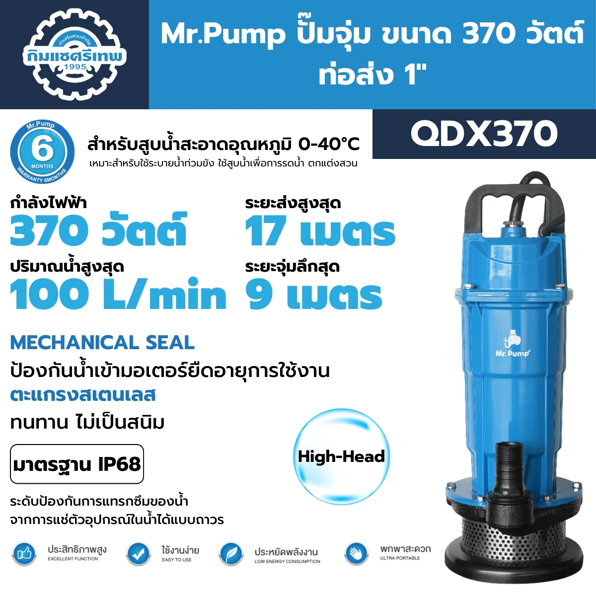 ปั๊มจุ่มน้ำดี Mr.Pump รุ่น QDX370 กำลังไฟ370 วัตต์ สูบน้ำสะอาดได้ถึง 0-40 °C แมคคานิคอลซิลป้องกันน้ำเข้ามอเตอร์ ตะแกรงสแตนเลสทนทานไม่เป็นสนิม เหมาะสำหรับใช้ระบายน้ำท่วมขัง ใช้สูบน้ำเพื่อการรดน้ำ ตกแต่งสวน มาตรฐาน IP68 ระดับป้องกันการแทรกซึมของน้ำจากการแช่ตัวอุปกรณ์ในน้ำได้แบบถาวร