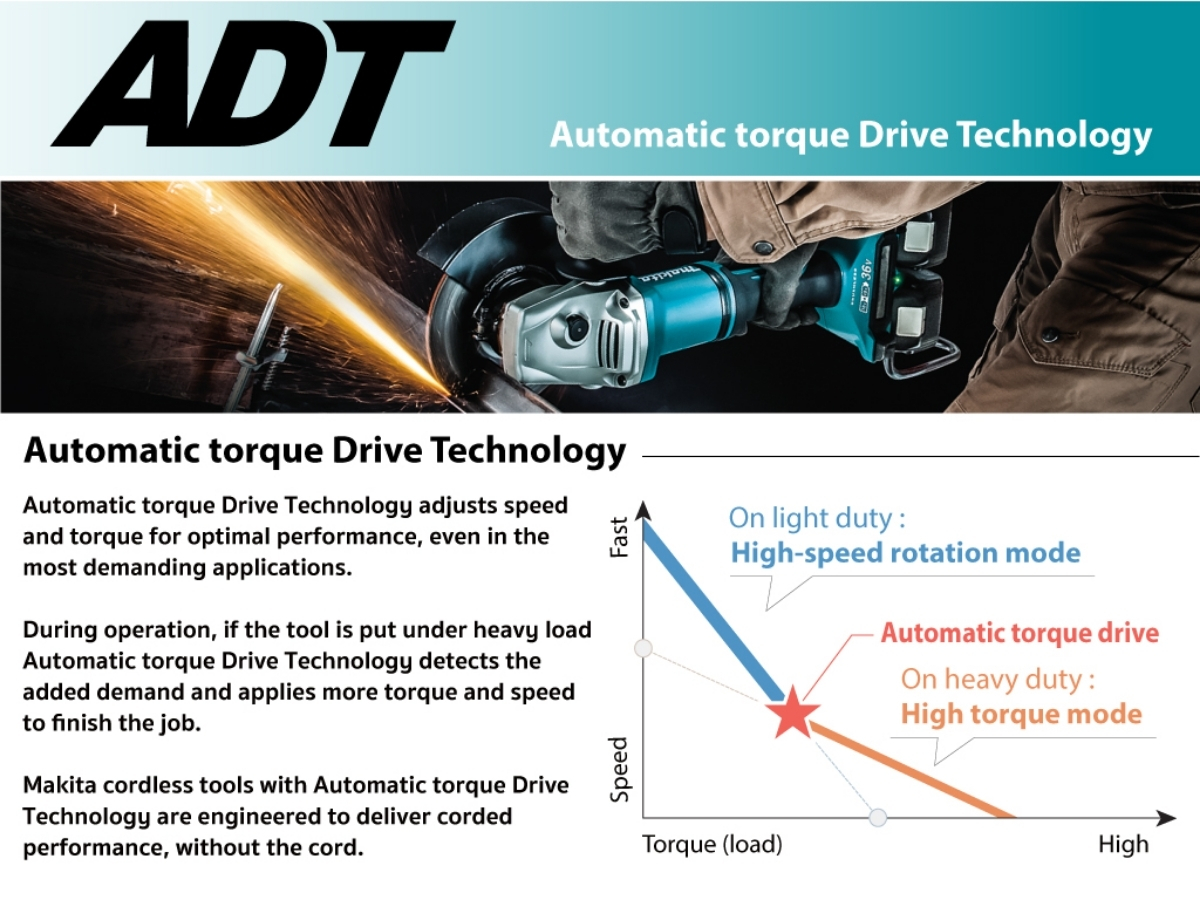 - เทคโนโลยี ADT (Automatic Torque Drive) ปรับความเร็วและแรงบิดโดยอัตโนมัติระหว่างการทำงาน เพื่อประสิทธิภาพที่เหมาะสมที่สุด