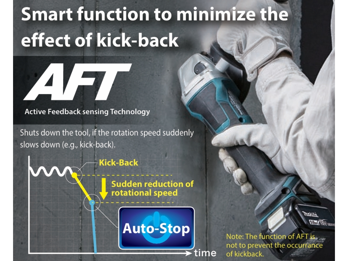 - เทคโนโลยี AFT (Active Feedback Sensing) ตัดการทำงานของมอเตอร์ทันที หากความเร็วรอบลดลงอย่างกะทันหัน หรือใบเจียรถูกบังคับให้หยุด