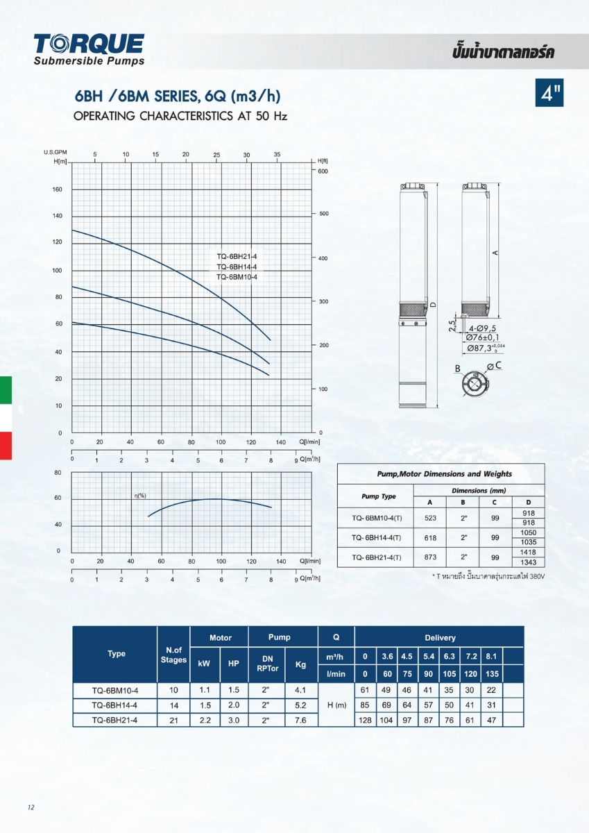 ปั๊มบาดาล TORQUE บ่อ 4" 1.5 แรง ท่อส่ง 2" 10 ใบพัด 380 V รุ่น TQ-SP-6BM10-4/T (ไม่รวมสายไฟ)