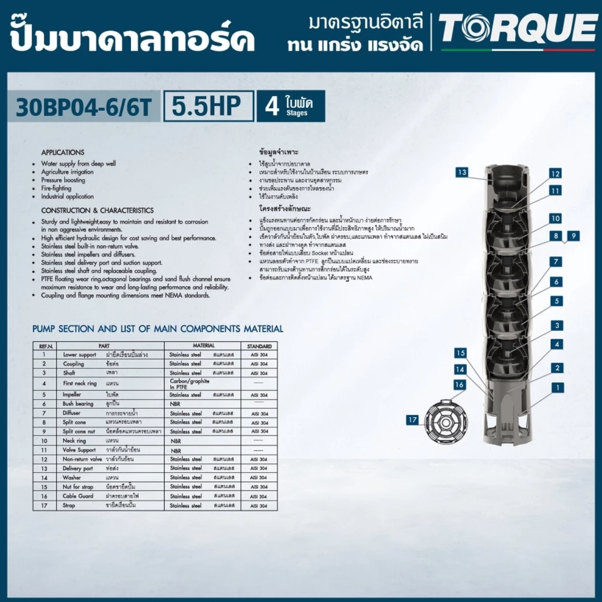 ปั๊มบาดาลทอร์คแตกต่างด้วยประสิทธิภาพที่ไม่เหมือนใคร มาตรฐานการผลิตระดับสากล โครงสร้างวัสดุและส่วนประกอบของตัวปั๊มถูกออกแบบโดยนวัตกรรมจากอิตาล