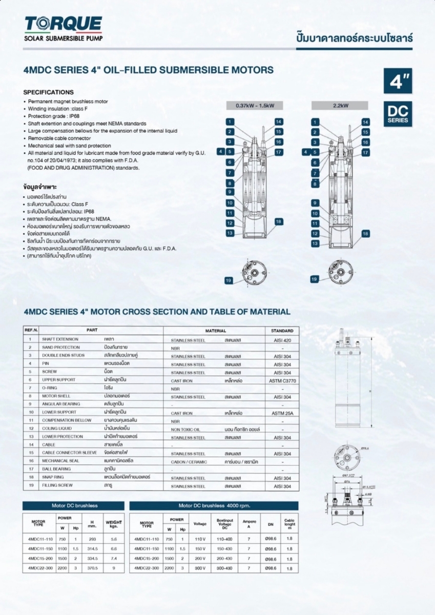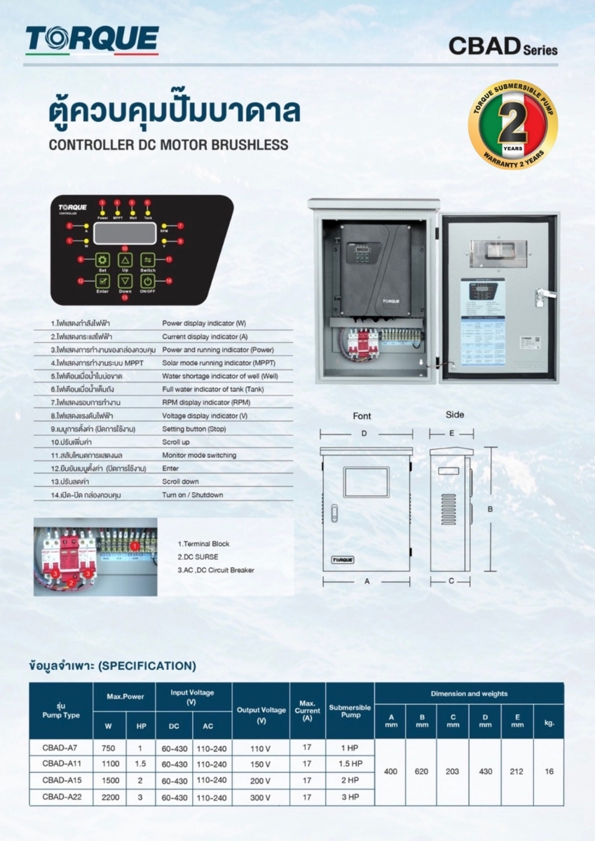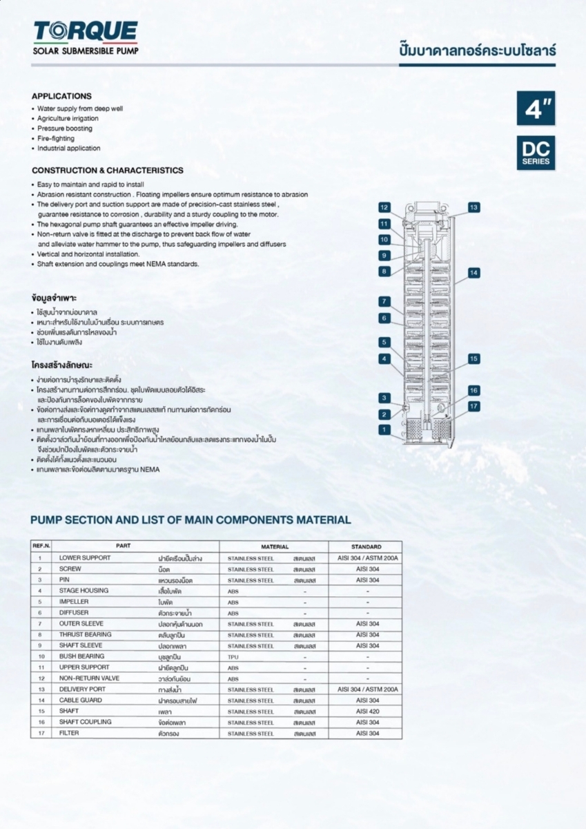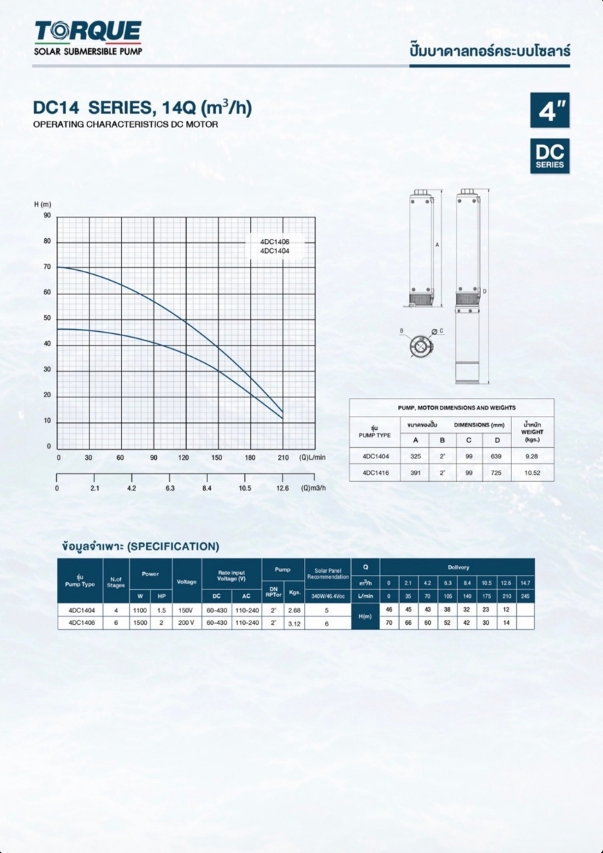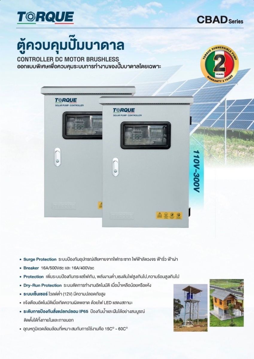 ปั๊มบาดาลพลังงานแสงอาทิตย์ประสิทธิภาพสูงจาก TORQUE รุ่นนี้ถูกออกแบบมาเพื่อการเกษตรและงานชลประทานที่ต้องการแรงดันน้ำสูงและอัตราการสูบน้ำปริมาณมาก ด้วยเทคโนโลยี AC/DC ทำให้สามารถใช้งานได้ทั้งจากแผงโซล่าเซลล์และไฟฟ้าบ้าน (220V) โดยอัตโนมัติ