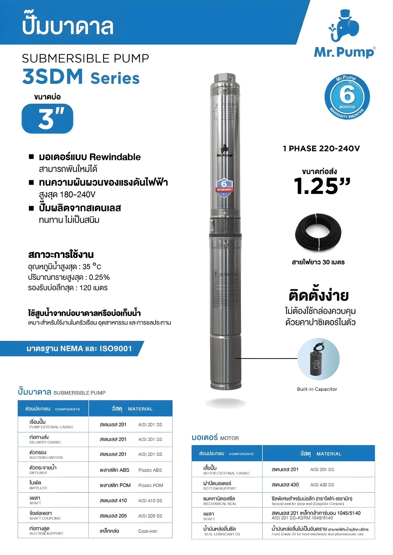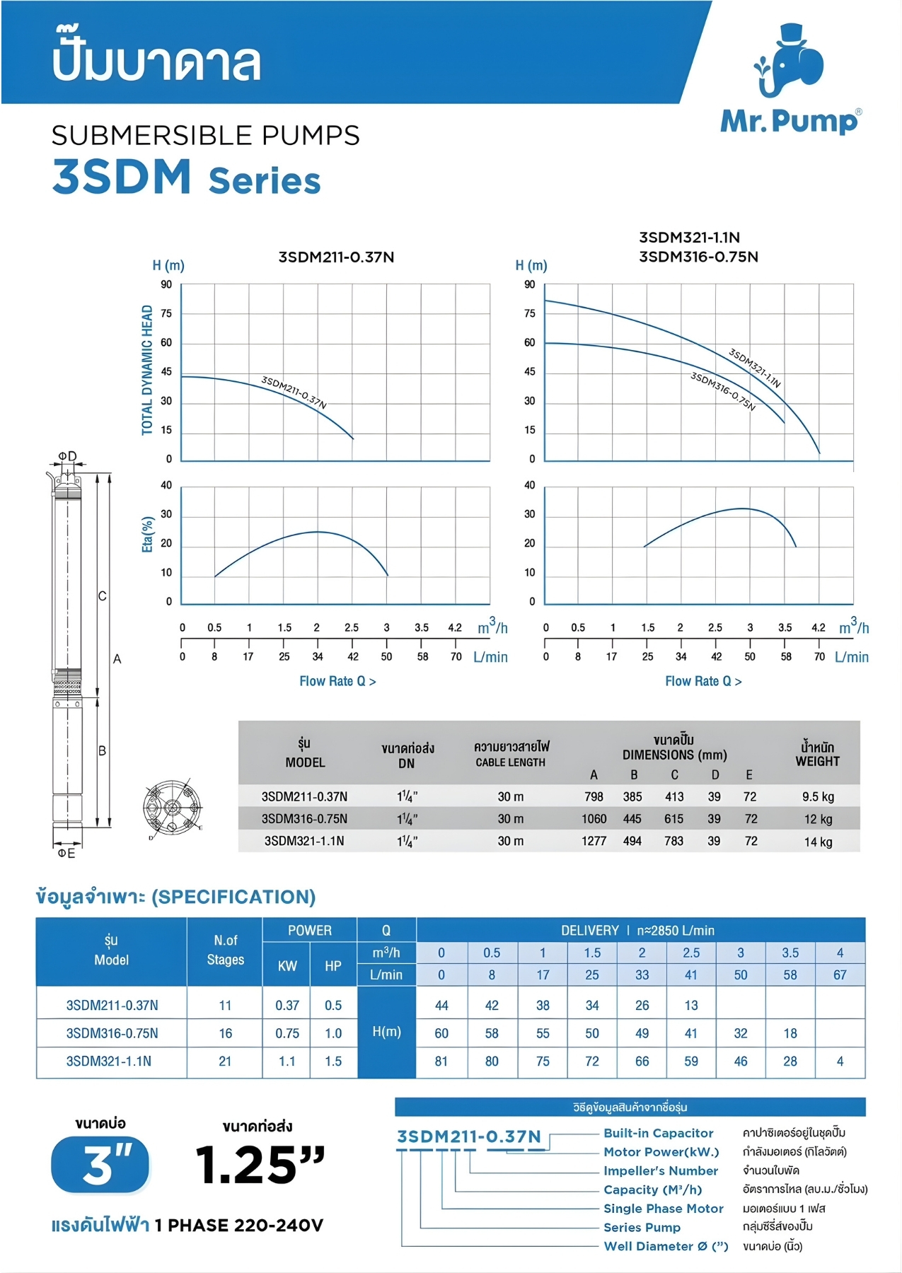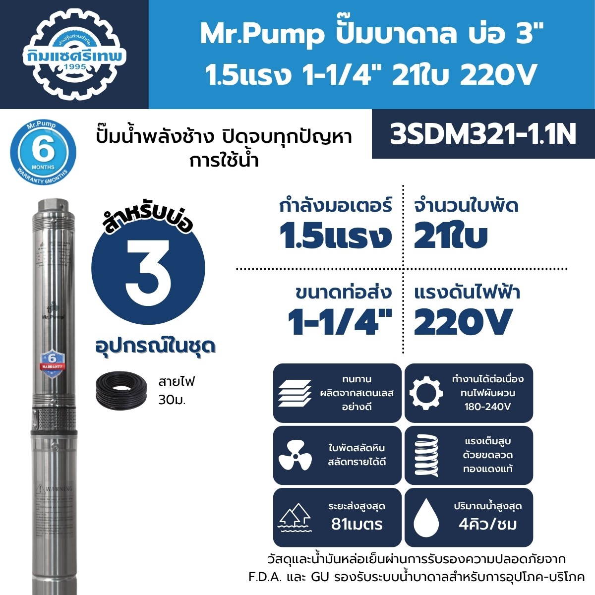 ปั๊มบาดาล มิสเตอร์ปั๊ม (MR.PUMP) บ่อ 3" 1.5 แรง ท่อส่ง 1.25" 21 ใบพัด 220 V รุ่น 3SDM321-1.1N