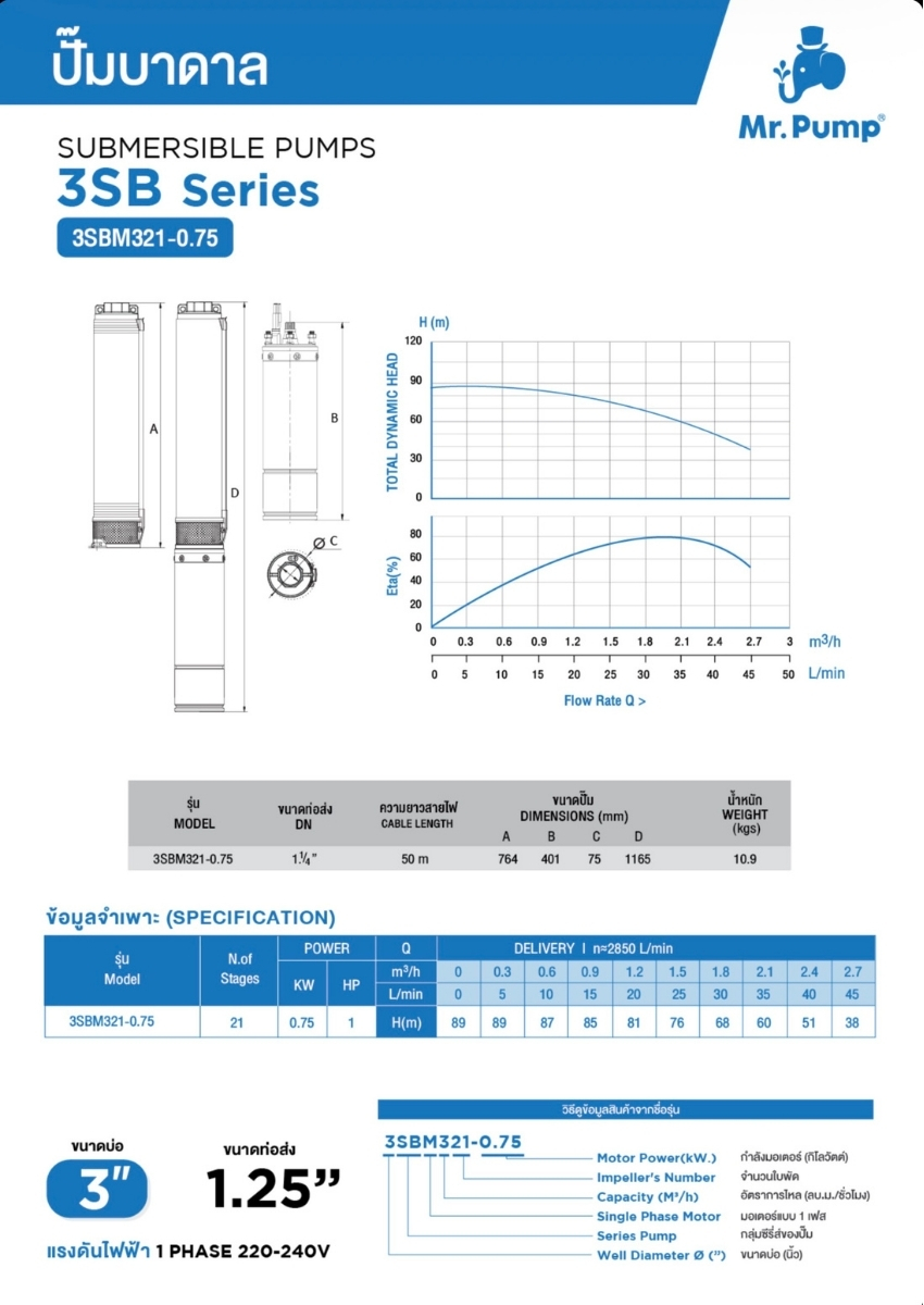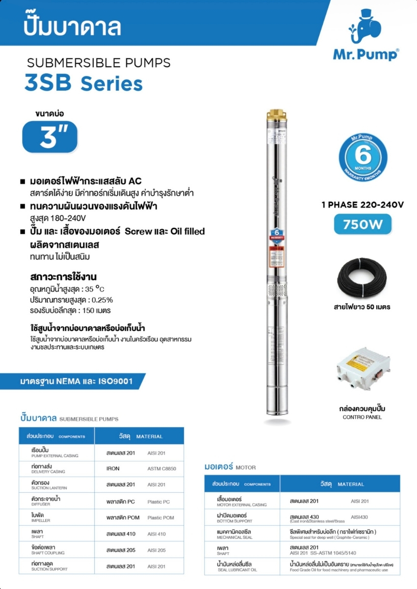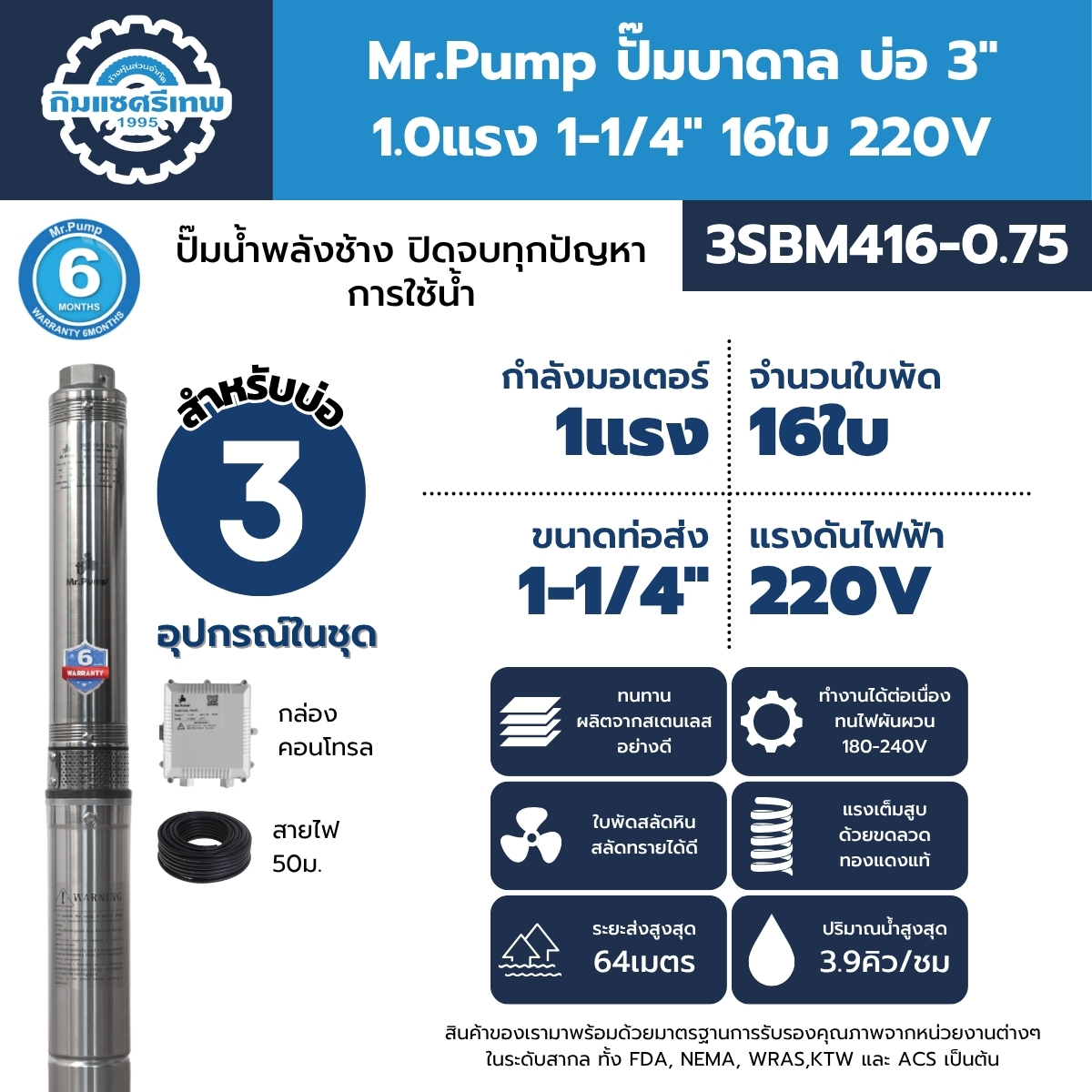 ปั๊มบาดาล มิสเตอร์ปั๊ม (MR.PUMP) บ่อ 3" 1.0 แรง ท่อส่ง 1.25" 16 ใบพัด 220 V รุ่น 3SBM416-0.75 (พร้อมกล่องคอนโทรล)