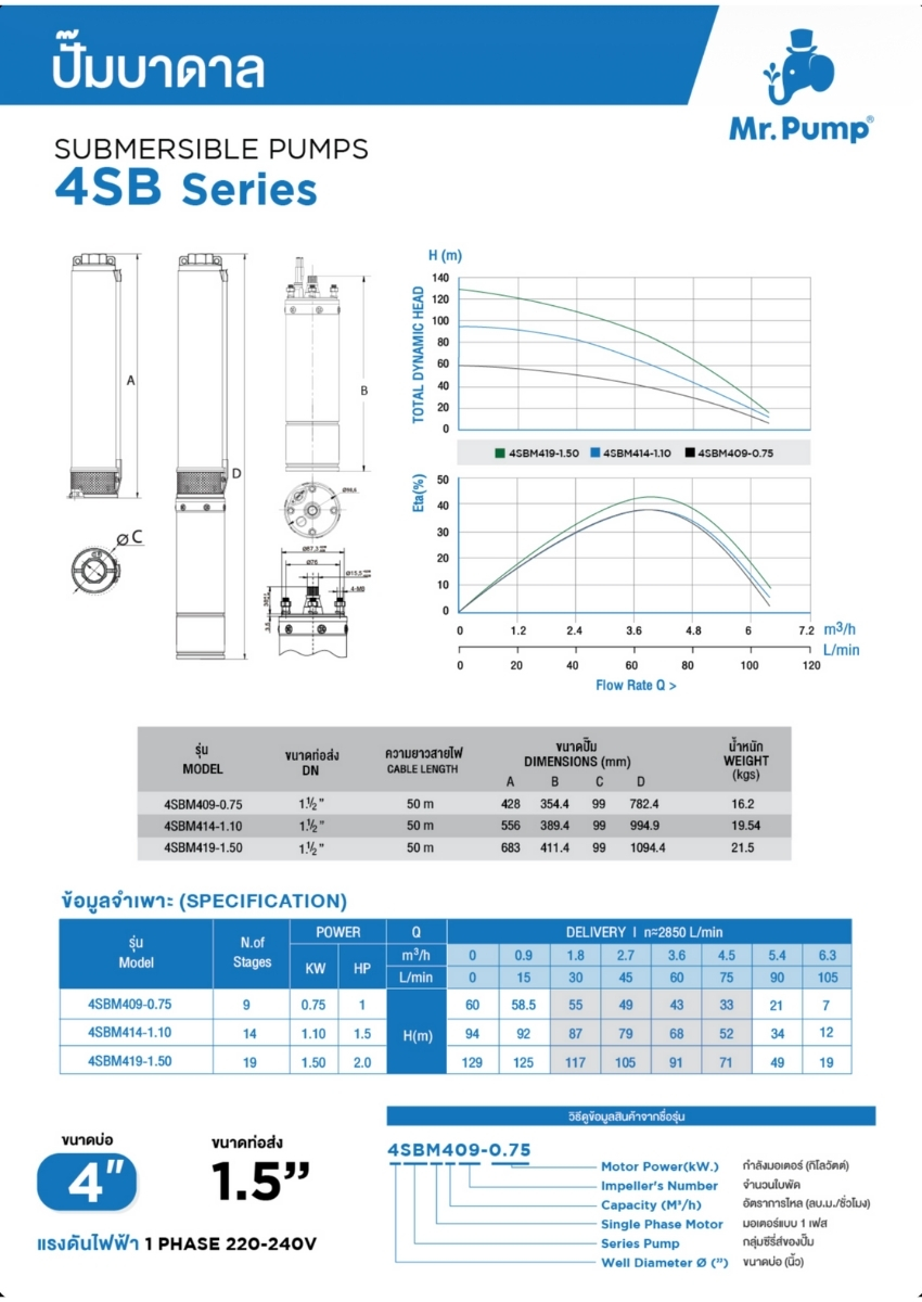 ปั๊มบาดาล มิสเตอร์ปั๊ม (MR.PUMP) บ่อ 4" 1.0 แรง ท่อส่ง 1.5" 9 ใบพัด 220 V รุ่น 4SBM409-0.75 (พร้อมกล่องคอนโทรล)