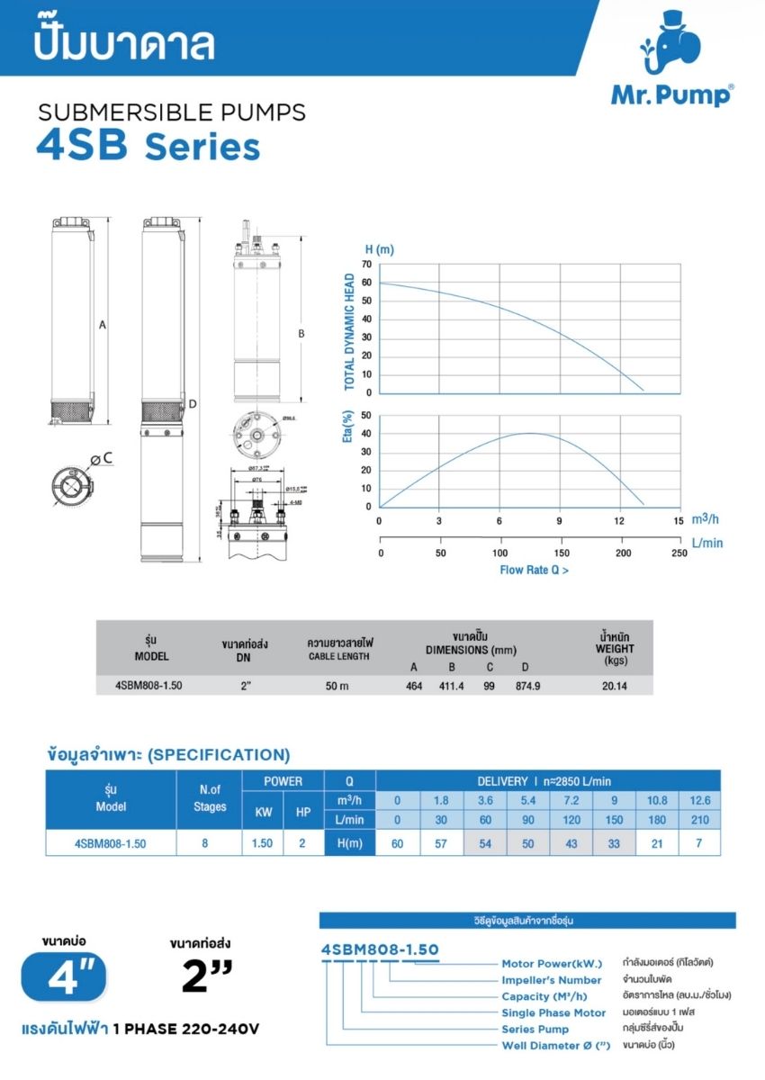 ปั๊มบาดาล มิสเตอร์ปั๊ม (MR.PUMP) บ่อ 4" 2 แรง ท่อส่ง 2" 8 ใบพัด 220 V รุ่น 4SBM808-1.50 (พร้อมกล่องคอนโทรล)