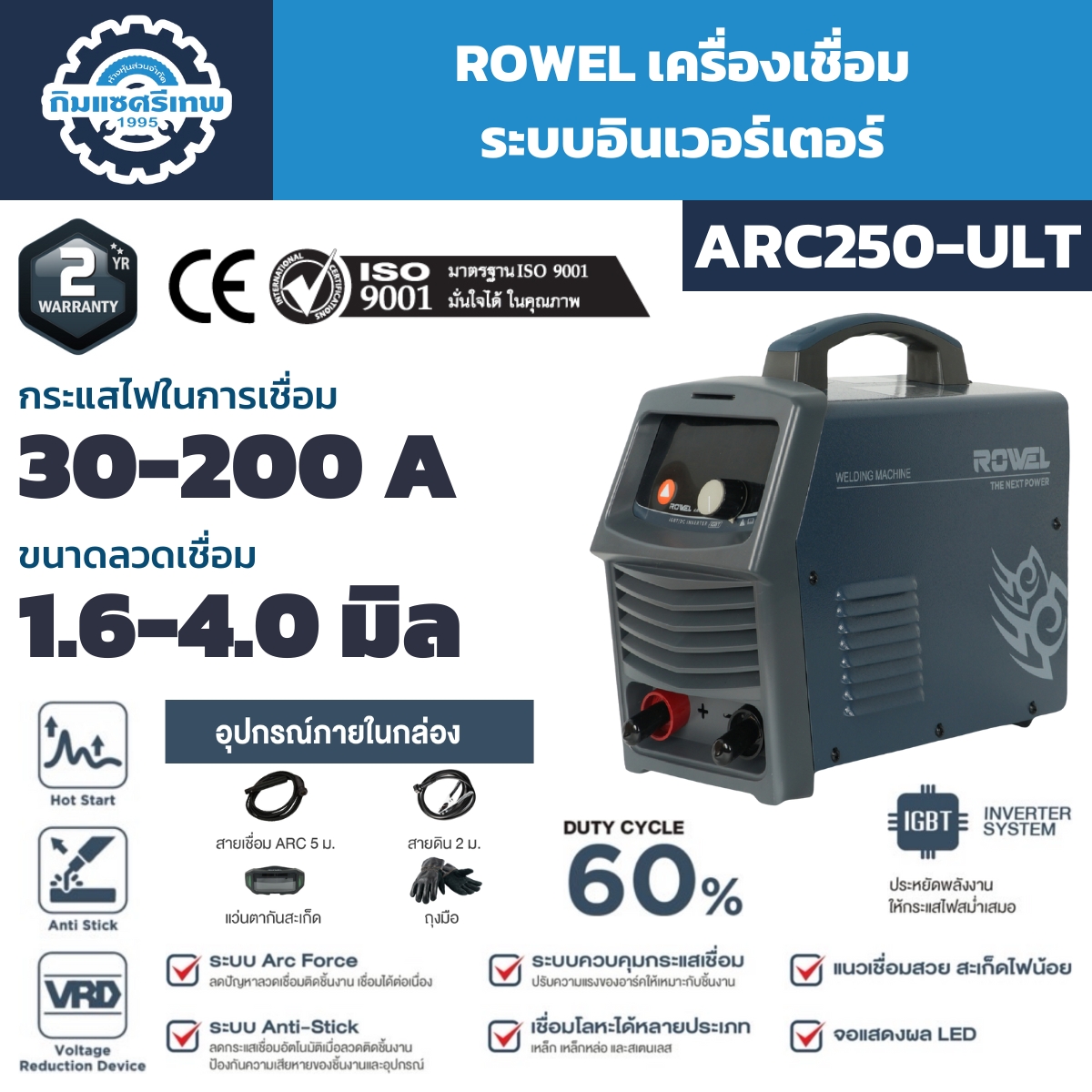 ROWEL ARC250-ULT สุดยอดตู้เชื่อมไฟฟ้าอินเวอร์เตอร์ที่ออกแบบมาเพื่อความคุ้มค่าและประสิทธิภาพ ด้วยเทคโนโลยี IGBT (Insulated Gate Bipolar Transistor) ช่วยให้กระแสไฟเชื่อมออกมาเต็มและเสถียร แนวเชื่อมสวย ซึมลึก และประหยัดพลังงานมากกว่าตู้เชื่อมระบบเก่า