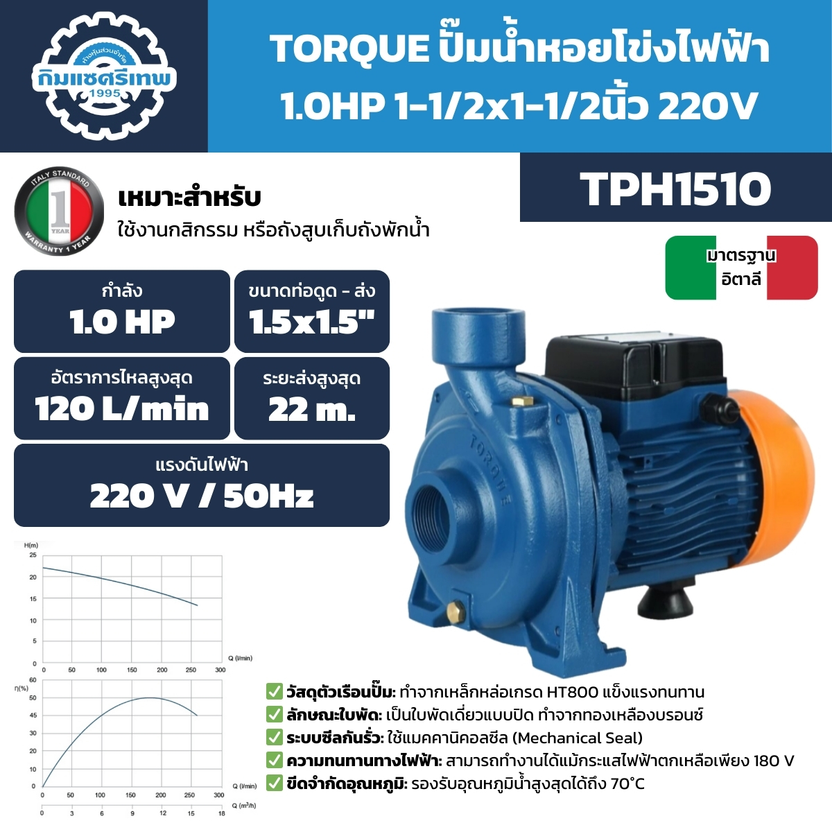 จำหน่ายปั๊มหอยโข่งไฟฟ้า TORQUE รุ่น TPH1510 ขนาด 1.0 HP ท่อ 1-1/2 นิ้ว ใบพัดทองเหลืองบรอนซ์ ทนไฟตกได้ถึง 180V รับประกันคุณภาพ ส่งน้ำได้ไกล แรงดันสม่ำเสมอ