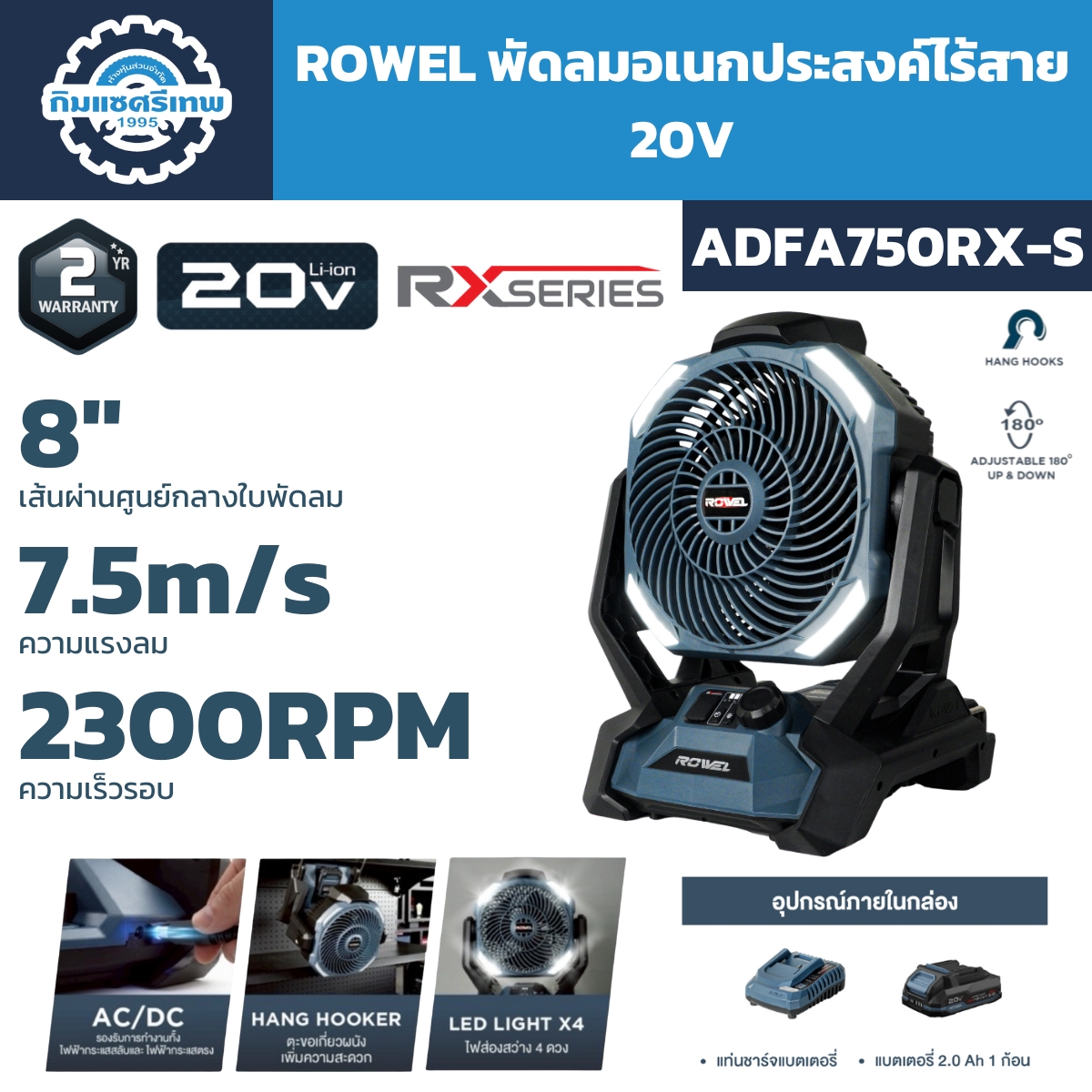 ROWEL รุ่น DFA750RX-S พัดลมไร้สายขนาด 8 นิ้ว ระบบแบตเตอรี่ 20V Li-ion ออกแบบมาเพื่อการใช้งานในพื้นที่ที่ไม่มีปลั๊กไฟหรือในไซต์งาน ให้แรงลมสูงสุด 7.5 เมตรต่อวินาที พร้อมความเร็วรอบสูงถึง 2,300 รอบต่อนาที ปรับมุมพัดลมขึ้น–ลงได้ 180 องศา กระจายลมได้ตรงจุดตามต้องการ มาพร้อมไฟ LED รอบตัวเครื่อง 4 ดวง ให้แสงสว่างขณะทำงาน และมาตรฐานกันฝุ่นกันน้ำระดับ IP54 เหมาะสำหรับงานช่าง งานก่อสร้าง งานกลางแจ้ง และการใช้งานทั่วไป