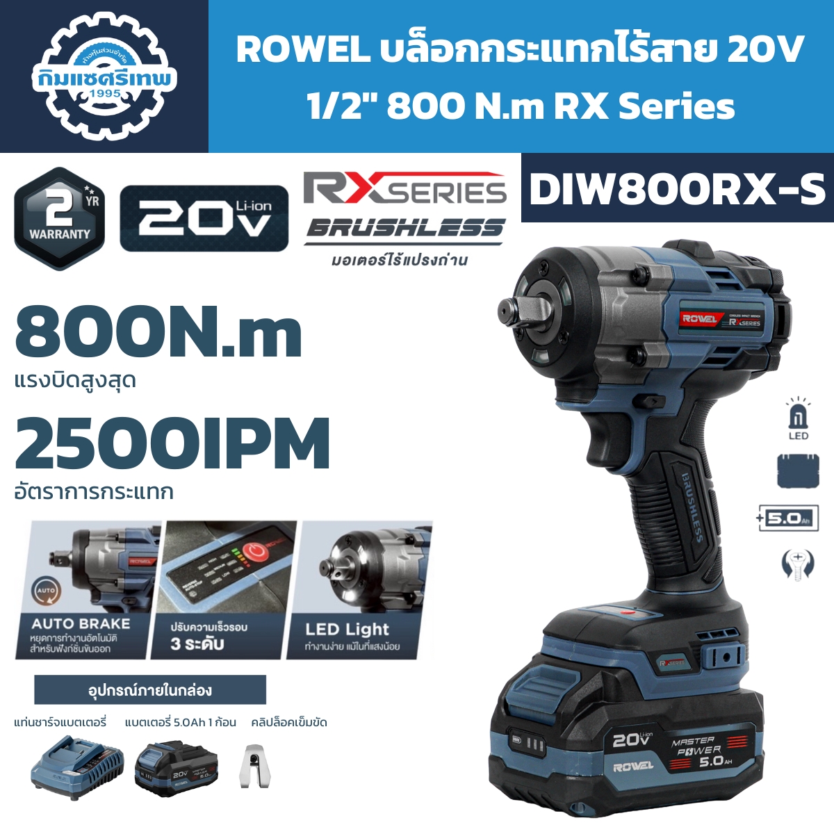 บล็อกกระแทกไร้สายระบบแบตเตอรี่ 20V Li-ion ROWEL รุ่น DIW800RX-S มอเตอร์ Brushless ให้พลังแรง ทนทาน และประหยัดพลังงาน เหมาะสำหรับงานขันน็อต งานซ่อมรถ งานโครงสร้าง และงานอุตสาหกรรมที่ต้องการแรงบิดสูงเป็นพิเศษ ให้แรงบิดสูงสุดถึง 800 นิวตันเมตร รองรับงานหนักได้อย่างมั่นใจ