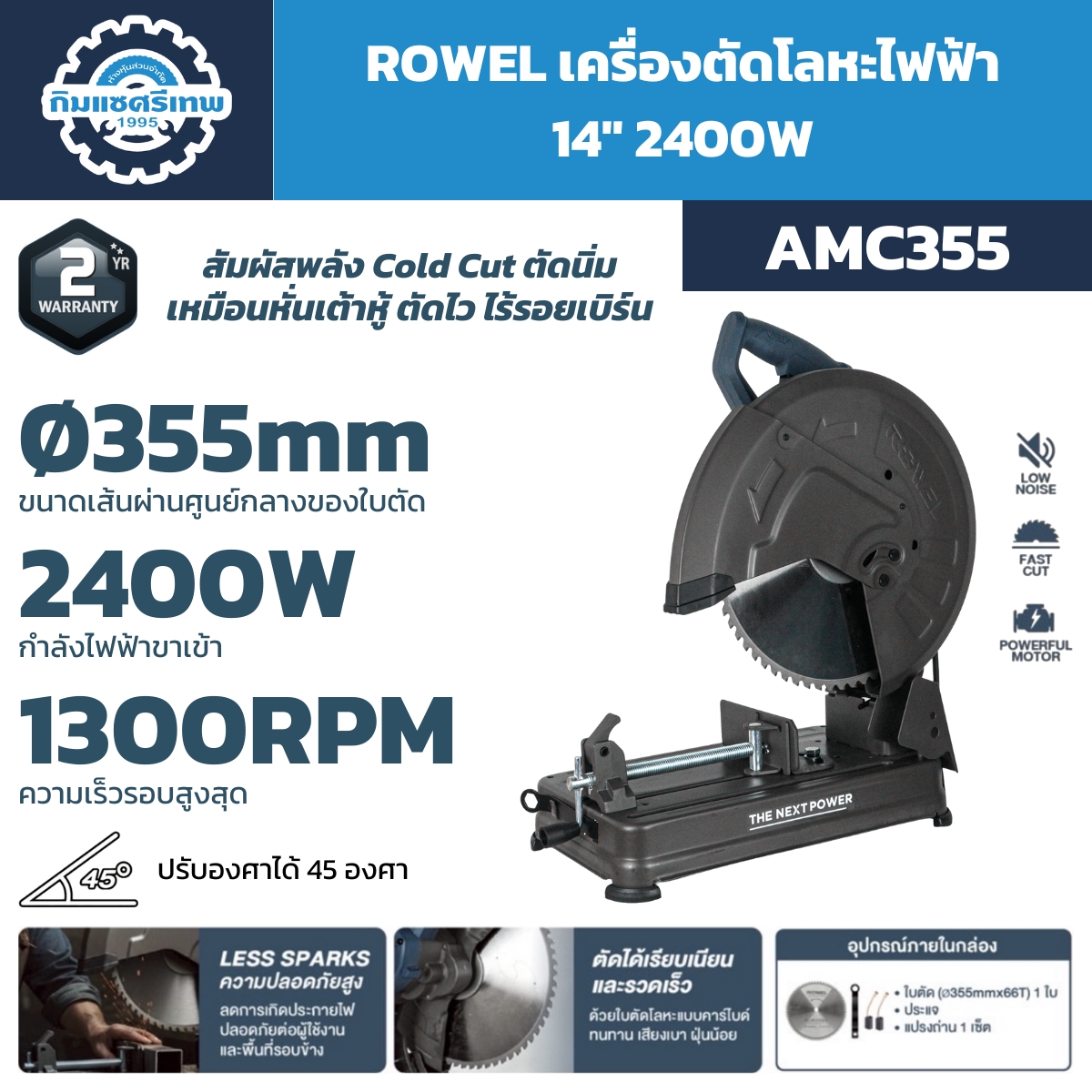 ตัวเครื่องมากับใบตัดคุณภาพสูงขนาด Ø355 มม. พร้อมอุปกรณ์มาตรฐานภายในกล่อง และรับประกันสินค้านาน 2 ปี มั่นใจในคุณภาพและความคุ้มค่าในทุกการใช้งาน