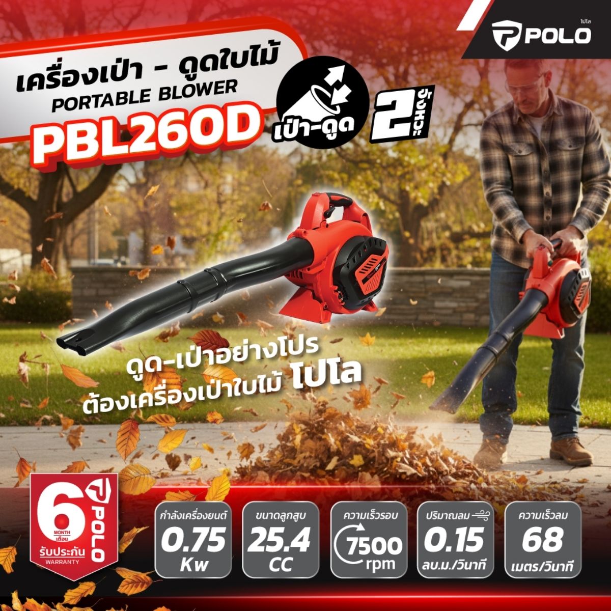 เครื่องเป่าลมและดูดใบไม้ 2-in-1 แบบมือถือ POLO รุ่น PBL260D ขนาด 25.4cc (0.75kW) น้ำหนักเบา พกพาง่าย เหมาะสำหรับทำความสะอาดสวน บ้าน และโรงงาน สั่งซื้อเลย!